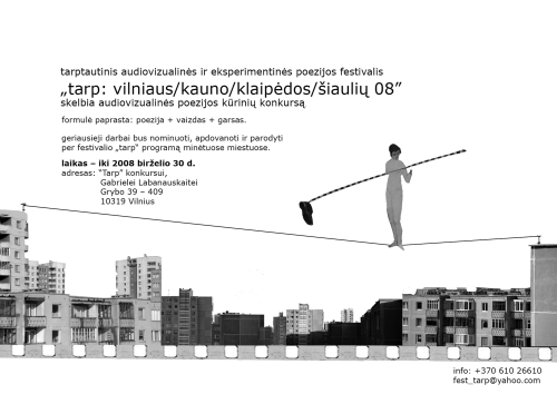 Tarptautinis audiovizualinės ir eksperimentinės poezijos festivalis „tarp: vilniaus/kauno/klaipėdos/šiaulių 08” skelbia audiovizualinės poezijos kūrinių konkursą.